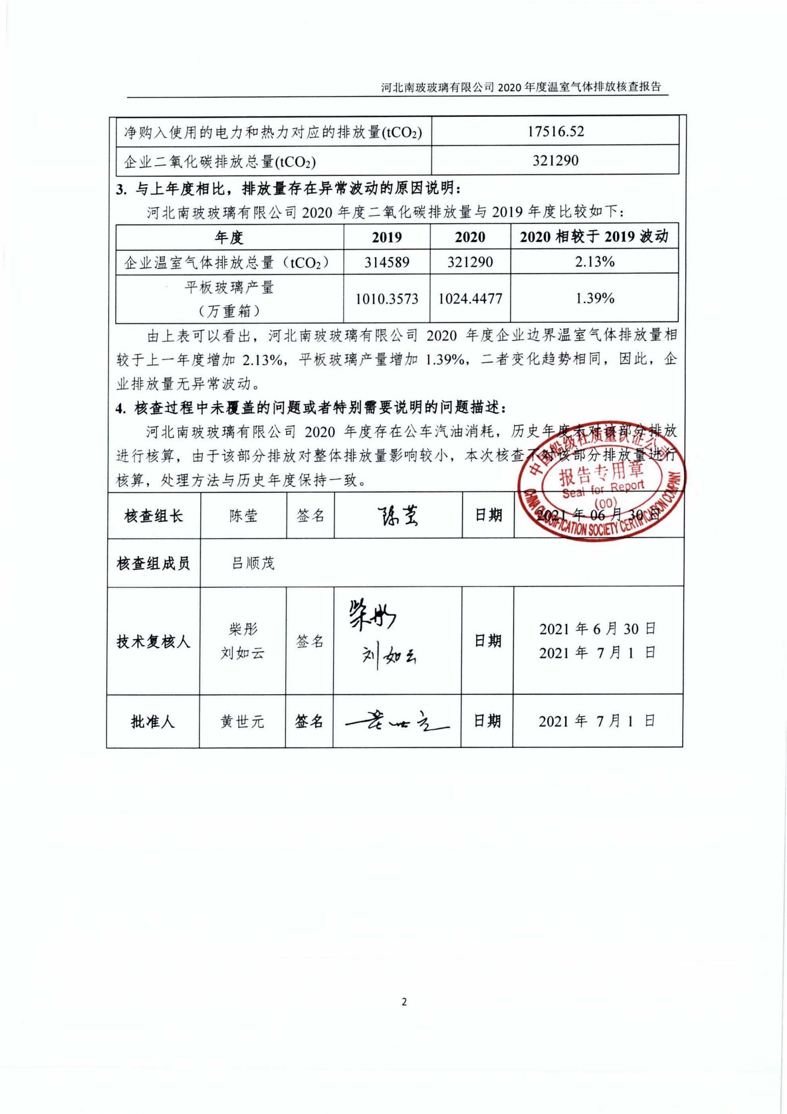 河北尊龙凯时人生就是搏玻璃有限公司2020年温室气体排放核查报告