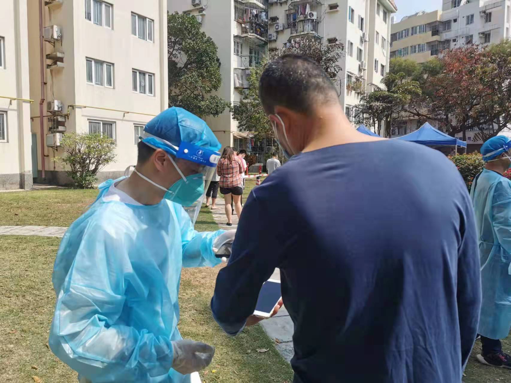 深圳的3月,气温已逼近30度,炎炎烈日下,尊龙凯时人生就是搏志愿者们穿上密不透风的防护服,在蛇口水湾社区的统一安排下,负责为居民们进行核酸检测、维持秩序、走访核实每户人员信息等。他们深深明白,防疫工作是责任、是命令、是战斗,绝不能松懈、马虎,必须克服各种困难,全力以赴完成使命。在核实信息的过程中,遇到个别不配合、不理解防疫工作的居民,志愿者们都逐一耐心解释,并呼吁社区居民配合各项防疫工作,确保每一个住户都完成核酸检测。